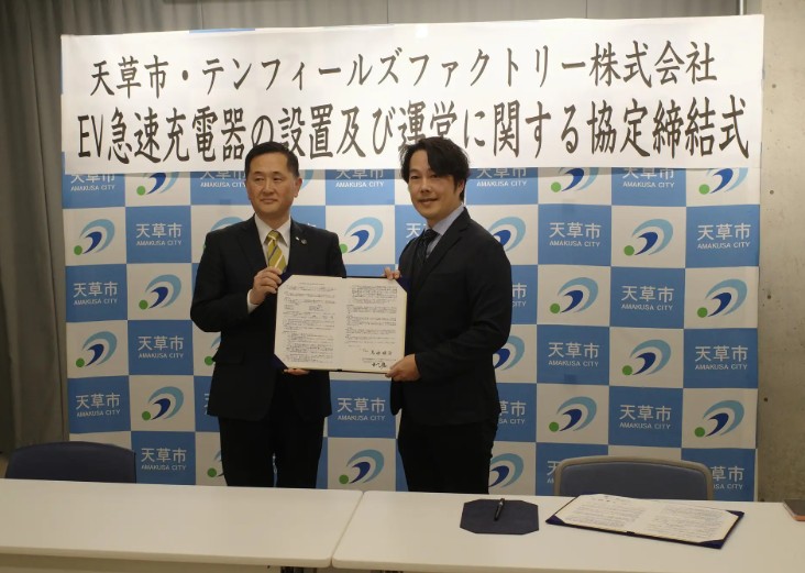 テンフィールズファクトリー株式会社(本社:京都府相楽郡精華町光台1-7けいはんなプラザ9F、代表取締役:市川 裕、以下「当社」)は、2026年1月28日、熊本県天草市役所にて、天草市の市長である馬場 昭治様と、天草市と当社における「EV急速充電器の設置及び運営に関する協定」の締結式を執り行いました。