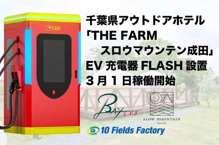 テンフィールズファクトリー株式会社(本社:京都府相楽郡精華町、代表取締役:市川 裕、以下「当社」)は、株式会社シー・ヴイ・エス・ベイエリア(本社:千葉県市川市、代表取締役:泉澤 摩利雄) が運営するアウトドアホテル「THE FARM スロウマウンテン成田(千葉県成田市)」にて、EV急速充電器「FLASH」の設置を完了し、3月1日(日)より本格稼働を開始したことをお知らせいたします。